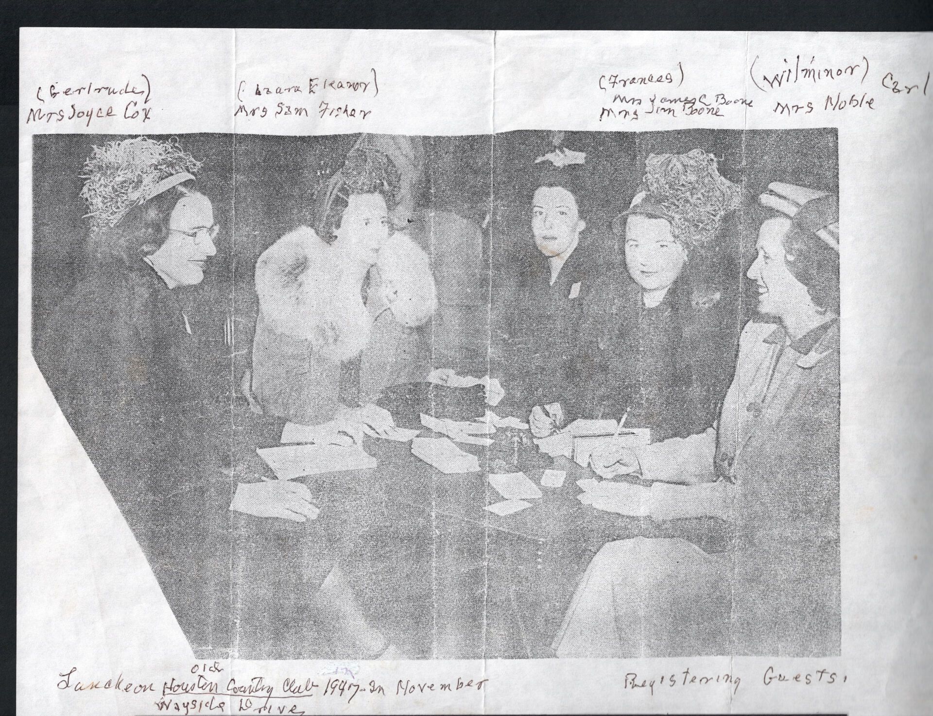 First, they organized four Spouse activities for the 1948 SBOT convention. There were two Sakowitz style show luncheons at the Empire Room of the Rice Hotel. Buses took visitors on a sight-seeing tour of the city, stopping to see several gardens, including those at the Bayou Bend, and wound up at old Houston Country club for refreshments. Plus, the WAHBA designed an innovative registration system so any attending lawyer could be found on the Convention floor, and they planned transportation for all the events.