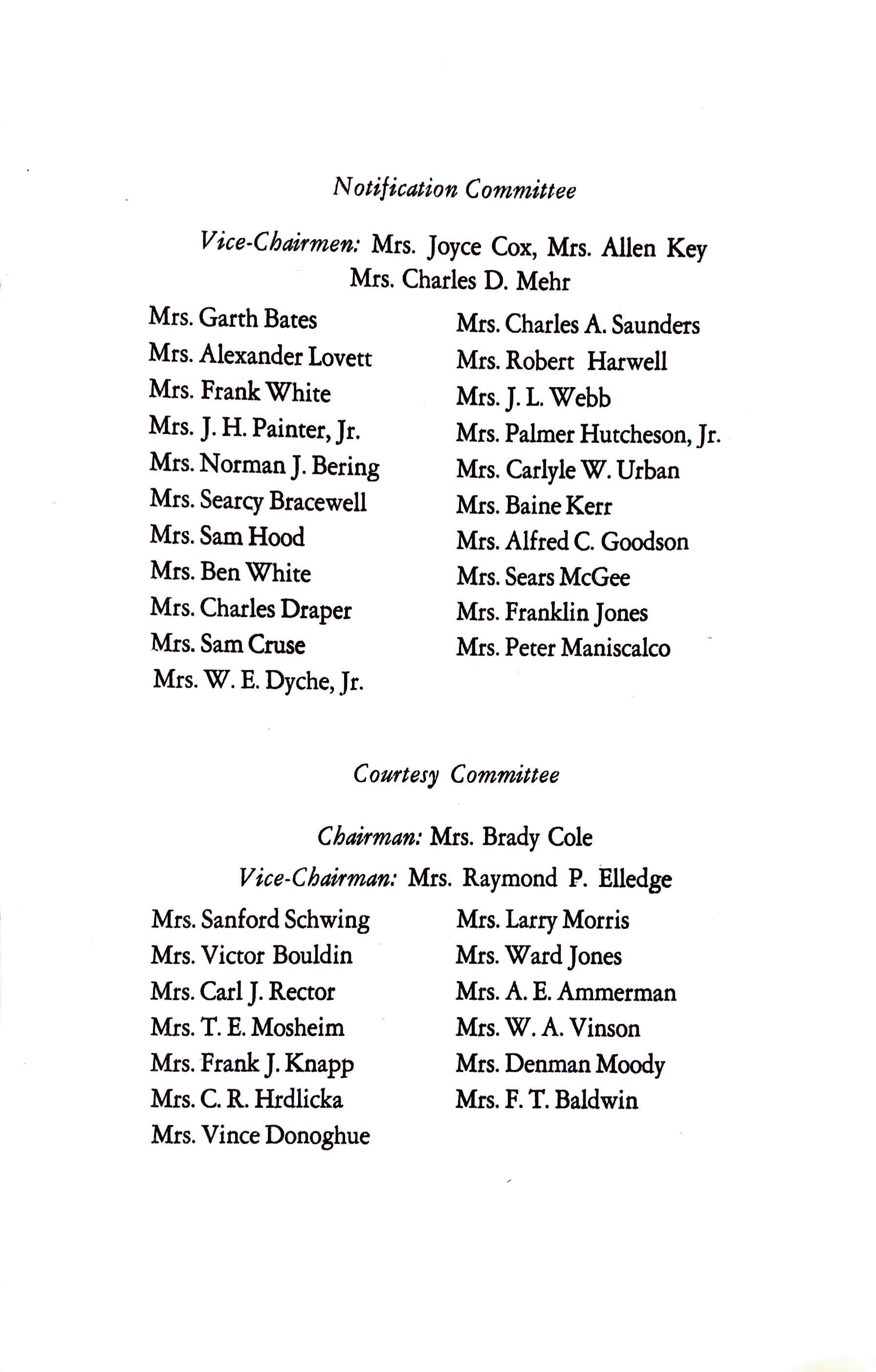 From the 1950’s through the 1970’s, the Auxiliary would grow to include 1200 members. Each year, Auxiliary events would follow that strictly SOCIAL pattern: Fall Coffee, Harvest Party, luncheon style shows, and its April Business meeting --- plus special assignments like spouse activities for SBOT Conventions held in Houston.